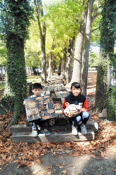 小朋友拾撿滿地的落葉、果實、種子等,創作桃花心木的手工藝品。