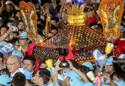 「大甲媽祖起駕了!」昨晚11點整,大甲鎮瀾宮鞭炮、煙火沖天,在鐘鼓齊響聲中,媽祖神轎緩步起身,副總統吳敦義、台中市長林佳龍、嘉義縣長張花冠、大甲鎮瀾宮董事長顏清標共同扶轎。圖/黃士航