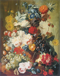 雖然只是靜物,但〈陶瓶中的水果與花〉卻滿溢著動感和充沛的能量,由水果和花卉堆成的小塔,豐盛得像是要往前傾倒下來。畫面上迸發出各式色彩和各樣質感,既是對大自然的禮讚,也是對畫家高明技法的頌揚。在雄偉的教堂背景襯托下,葡萄、李子、鳳梨,連同玫瑰、康乃馨、鬱金香及其他許多的小生物,全都放在一塊兒了。每一個細節都是這麼的精美,彷彿只要伸出手,我們就可以摸到花瓣上的露水或莖上扎人的尖刺。