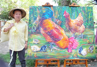 去年7月,陳明順以1幅公雞、母雞帶8隻小雞的油畫《幸福》,入選法國藝術家沙龍選拔。