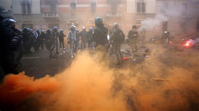 路透說,警方向抗議人群發射催淚彈,並動用高壓水槍鎮壓示威遊行。據報導,有數千名義大利警察在事發當時被部署到米蘭承擔當地的安保任務。警方一度關閉數個地鐵站以防止騷亂擴大。