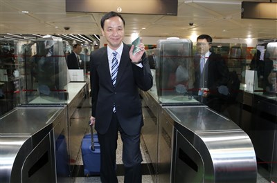 國民黨主席朱立倫上午搭乘長榮航空班機前往中國大陸,他也展現親民作風與民眾一起依照正常程序出境,透過移民署自動查驗通關系統。圖/鄭超文