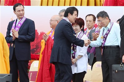 佛光山上午在總統府前凱達格蘭大道慶祝佛誕節,政界要腳全到齊,馬英九總統(右三)到場時和台北市長柯文哲(右一)等現場來賓一一致意。圖/胡經周