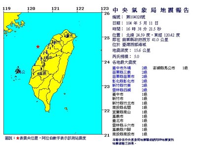 【中央社台北訊】台灣西部海域今天下午4時38分,發生芮氏規模5.0地震,地震深度15.6公里,中央氣象局地震測報中心主任郭鎧紋說,這次是苗栗外海百年來的第5大地震。