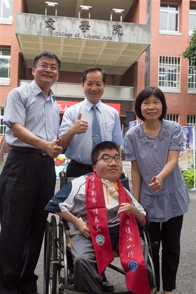 【本報台北訊】台灣師範大學歷史系大四生葉冠宏,罹患關節攣縮等多重病症,出生後就與輪椅、呼吸器、抽痰機為伴,但他不畏病痛纏身,大學4年兩度領取「書卷獎」,還以優異成績直升碩士班,回報多年來不分晝夜照顧他的媽媽。台師大學校今天為他和媽媽掛上「跨山越海」成年禮彩披,肯定他的學習鬥志。
