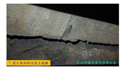 【本報台北訊】大巨蛋大底結構未完成,影響板南線爭議不斷。台北市議員童仲彥今指出,根據捷運局到隧道內查看的照片,發現隧道環片與仰拱混凝土(隧道下方的土)脫開分離,讓他看了直呼「快昏倒」。童表示,捷運局長周禮良之前還稱這叫「感冒流鼻水」,但他依照片來看,裂的裂、漏水的漏水,根本是「生大病」。