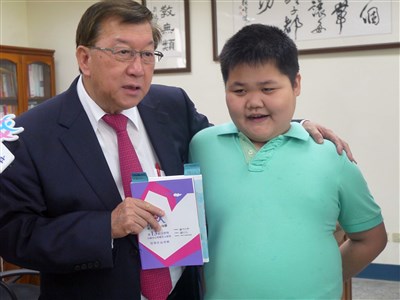 患有自閉症的蒙建安(右),學會用「鍵盤」與外界溝通,還發掘出寫作天賦,獲今年總統教育獎,新竹縣長邱鏡淳(左)15日也贈書肯定。圖/中央社