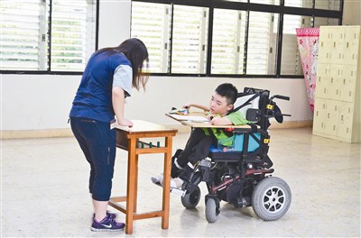 宜蘭縣羅東國中學生陳景維(右圖右),罹患肌肉萎縮症、樂觀進取,昨日坐電動輪椅參加國中會考。圖/廖雅欣