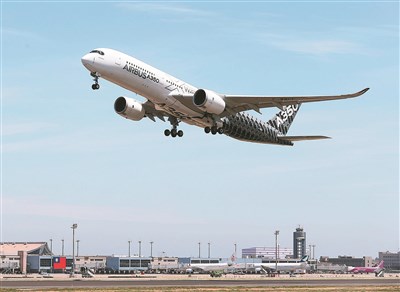 空中巴士A350-900型客機18日上午從桃園機場起飛,搭載貴賓及媒體記者繞行台灣飛行展示。圖/陳嘉寧