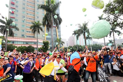 基本工資7月起調高,勞保局今天宣布7月1日起修正勞保、勞退薪資分級表。圖為今年五一勞動節遊行反低薪,勞工在立法院前丟擲紙芭樂球,抗議政府官員亂開芭樂票。圖/資料照片