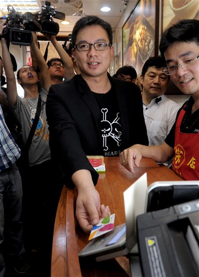 悠遊卡公司董事長戴季全(中)今天體驗悠遊卡小額消費刷卡付費功能,宣導即日起到北市寧夏夜市消費,可刷悠遊卡付款。圖/中央社