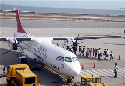 復興航空ATR72-500型飛機,21日中午自馬公機場起飛,一度單引擎失效,駕駛依程序重新恢復啟動,飛機平安降落松山機場;圖為復興航空同型機種。圖/中央社