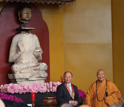 佛光山開山星雲大師(右)、大陸國家文物局長勵小捷(左)今天上午主持莊嚴的「金身合璧 佛光普照」儀式。圖/劉學聖