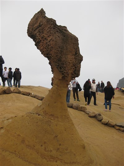【本報台北訊】享譽國際的野柳「女王頭」恐怕難逃斷頭命運;交通部觀光局北海岸及觀音山國家風景區管理處委託台大高分子所教授謝國煌進行奈米塗料補強岩石技術戶外實驗,觀察9個月後發現,北海岸溫度、溼度與日照變化大,加上冷熱收縮劇烈,4顆實驗蕈石出現剝落、白化現象,近期將用新方法重新施作,若科技無法克服大自然的威力,預估5到10年女王頭就會斷頸。