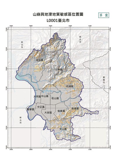 經濟部地調所指出,北市山坡地主要是北邊的大屯火山系與東北西南向的加裡山脈,前者分布在北投、士林區一帶,畫定的地質敏感區廣闊但零星;後者橫貫內湖、南港、信義與文山等區,地質敏感區集中,其中基隆河北岸的大直、內湖一帶、以及南港區拇指山系,除山崩地質外,順向坡比例也偏高。