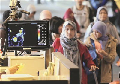 南韓出現中東呼吸道症候群(MERS)確診患者,在機場對旅客偵測體溫,對評檢疑似患者的發燒溫度從攝氏38度下調至攝氏37.5度。圖/美聯社