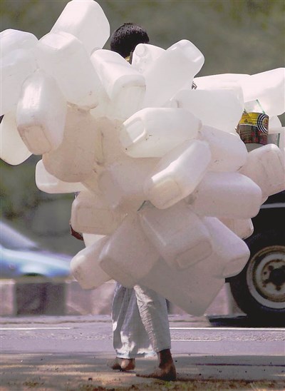 度熱浪侵襲,已造成至少800人喪命;圖為加爾各答街頭小販兜售水桶。圖/法新社