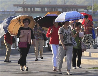 中央氣象局表示,持續受西南風影響,今日全台的高溫在攝氏30度以上,多數民眾都撐傘以防日曬。圖/中央社