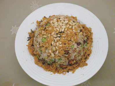 米粒各三大匙。紅蘿蔔三分之一條、紫蘇梅五粒、素肉鬆二大匙、松子適量。