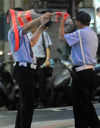 保全員頻傳過勞死,勞委會訂出保全員工時上限不得超過288小時。圖為兩名負責交通引導的保全員交班。圖/資料照片