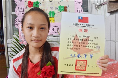 台東紅葉國小,24日舉行畢業典禮,畢業獎少了「政治味」,沒有縣長獎、鄉長獎、會長獎,而是以野生動物獎為獎項。女學生邱玟萱(圖)各項成績優異,拿下畢業最大獎—台灣黑熊獎。圖/中央社