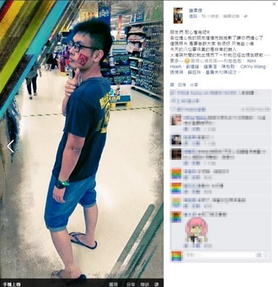 【中央社新北訊】遊客謝聿揆昨晚在新北市八仙樂園粉塵爆炸現場救了許多人,還不忘鼓勵傷者要撐下去。事件稍告段落後,他才知原來自己也受傷,超過5萬名網友今天在他的臉書稱讚。
