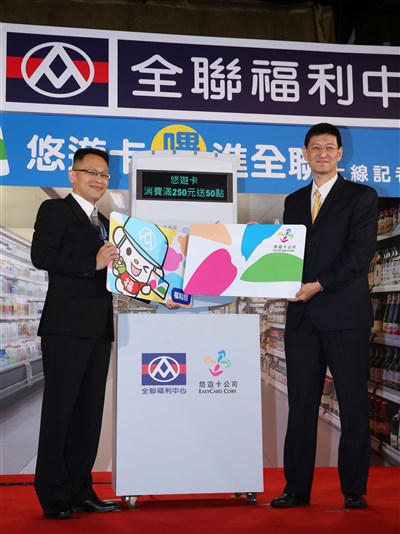 悠遊卡公司與全聯福利中心合作,7月1日起全聯門市啟用悠遊卡付款,上午悠遊卡公司副總經理林季良(右)、全聯福利中心副總經理鄭大智(左)共同出席上線啟動儀式。圖/陳瑞源