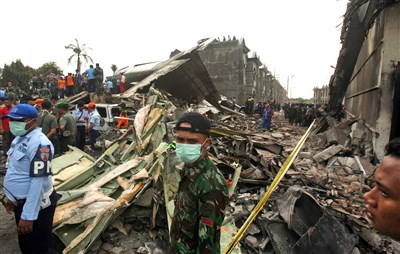 印尼軍方這架力士C-130式運輸機(Hercules C-130)今天墜毀在棉蘭市,波及兩戶民宅及1輛汽車。墜機所在地附近建築也明顯有受損情況。