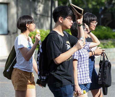 大學指考今天上午登場,在30多度的炎熱高溫下,有考生一早就拿著冰棒,消消暑氣。圖/程宜華