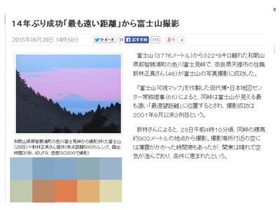 曾製作「富士山可視地圖」的日本地圖中心常務理事田代博表示,2001年9月也曾有人在相同地點拍到富士山。位於和歌山縣那智勝浦町的色川富士見峠是能看到富士山的「最遠望距離」。