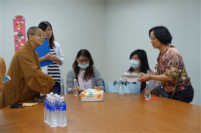 佛光山慈善院長依來法師(左)今天到高雄長庚醫院探視塵爆病患家屬。圖/佛光山慈善院提供