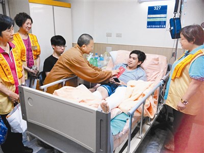 新莊擇善寺住持永堂法師,昨天帶領佛光會員到醫院慰問傷者,並贈送慰問金、觀音像、《貧僧有話要說》書籍。圖/新莊擇善寺提供