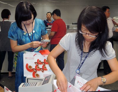 新北市社會局人員上午在大批員警的戒護下,自台銀提領7340萬元現鈔,經點鈔機點鈔後,分裝成10與20萬元不等的紅包袋,放入紙袋中,分交各局處約400名人員,在警員護送下送往54家醫院。