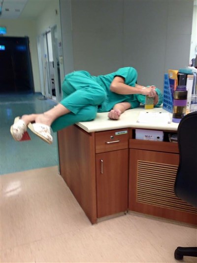 【本報桃園訊】八仙樂園塵爆意外後,第一線醫護人員不眠不休搶救傷患,許多醫護人員都累癱了,「我是中壢人」臉書粉絲團貼出一張醫護人員直接睡在桌上的照片,並說「桃園醫院醫護人員累癱,您們辛苦了!」該照片曝光1小時,即吸引超過1.5萬人按讚,網友們紛紛留言鼓勵。