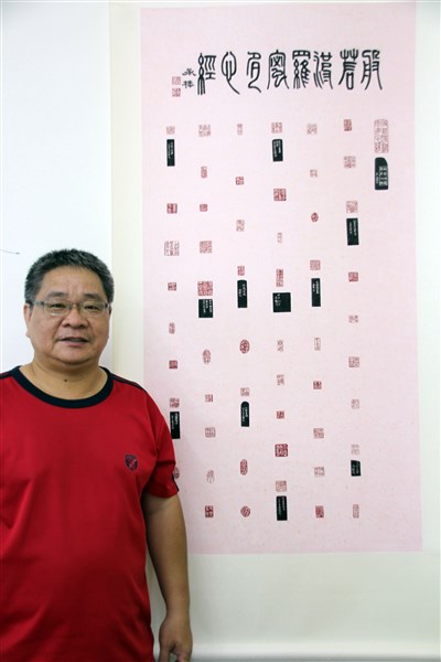 退休教師蔡承樺學篆刻,原本希望在5年內篆刻一部《心經》,沒想到1年就完成,今起在嘉義市地藏庵展出。圖/中央社