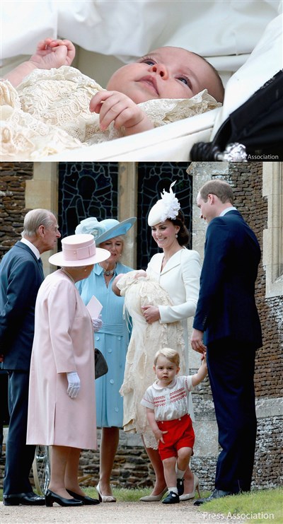 小公主穿著喬治曾穿過的同一件禮袍,這件蕾絲緞面禮袍是按照維多利亞女王(Queen Victoria)長女1841年穿過的袍子仿製。小公主躺在女王伊麗莎白二世(曾使用過的復古推車上,由母親凱特推著參加儀式。凱特身穿一襲優雅米白色洋裝和同色的帽子。