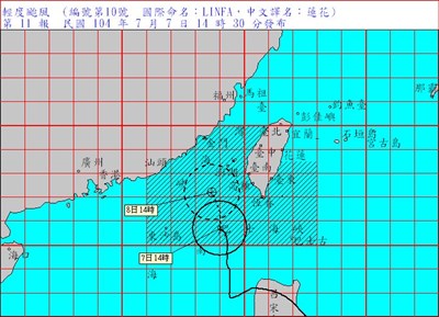 輕颱蓮花路徑偏西,下午2時30分解除陸上颱風警報。圖/中央氣象局
