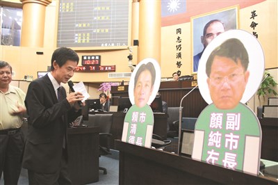 【本報台南訊】台南市議會定期大會總質詢今天登場,市長賴清德堅持不進議會,市議員不想對著空氣質詢,製作了人形立牌放著官員席上,怒斥賴清德無法無天。