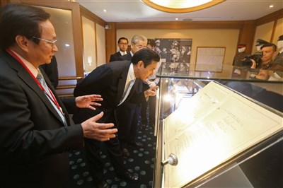 總統馬英九(左2)7日與國史館館長呂芳上(左1)出席「抗戰勝利70周年國際學術研討會」開幕,並參觀日本政府向同盟國投降降書正本。圖/中央社