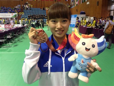 在南韓光州舉行的2015年世界大學運動會,中華代表團傳回捷報,18歲的女將廖文暄在跆拳道品勢項目並列銅牌,中華代表團的首面獎牌開張。圖/中央社