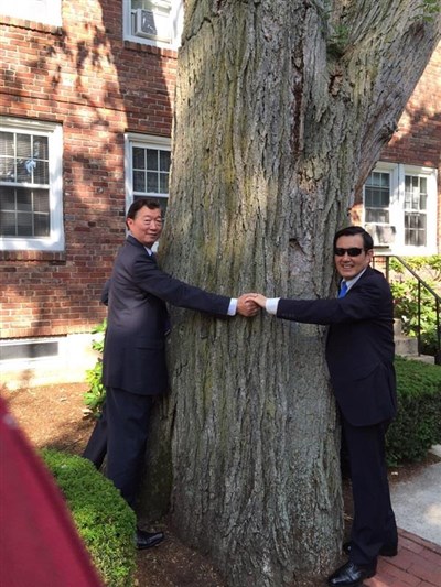 馬總統(右)重返母校哈佛,特地去看了「念念不忘的大樹」,還拉著駐美代表沈呂巡(左)一同熊抱大樹。圖/中央社