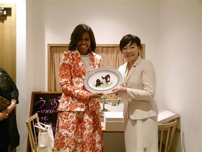 日本第一夫人安倍昭惠(右)希望在官邸打造1個大蜂巢,顯然是從美國第一夫人蜜雪兒(左)那裡得到靈感,最快今年秋天「安倍牌」蜂蜜可出爐。圖/資料照片