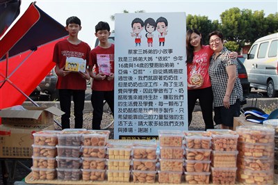 【本報台北訊】「每一個布丁及奶酪都是我們親手製作,只希望能用自己的力量堅強地活下去。」大型的看板上寫著蔡依紋和2個雙胞胎弟弟的故事,他們原本跟媽媽相依為命,但媽媽罹癌去世後,3姐弟跟著阿嬤做布丁、奶酪,在臉書上行銷,因為都念私立高職,學費負擔重,希望暑假多接訂單,賺取學費和生活費。
