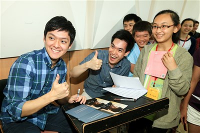 台灣小提琴家曾宇謙(左一)與林品任(左二)受邀至北市交青少年音樂營分享音樂之路。圖/林伯東