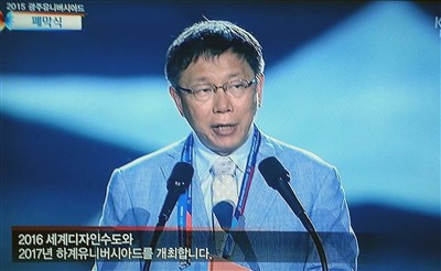 南韓光州世大運落幕,下屆2017年世大運將由台北市主辦。台北市長柯文哲今天晚間參加光州世大運閉幕典禮表示,台北市歡迎大家。圖/中央社