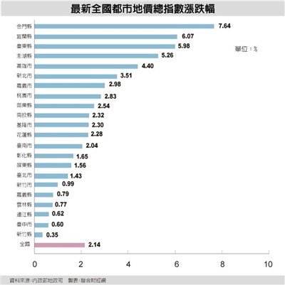 根據內政部資料,全國僅新北市及高雄市2個直轄市,以及宜蘭、台東、澎湖及金門4個縣漲幅超過3%。