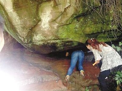 村民說,陰陽洞位於水庫岸邊一處山坡的半山腰,下船沿著泥濘小路走約8分鐘,陰陽洞就在一塊高約3公尺倒三角形的巨石下。兩個形狀不一的小洞口分別位於巨石左右下方。