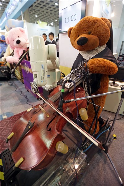 新科技大學機械工程系將機器手臂應用在樂器上,組成機器人弦樂團,由電腦同步控制,合奏出多首知名樂曲。圖/中央社