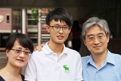 104年大學指考成績公布,嘉義高中陳宇安(中)考得台大醫學系採計科目全校最高分477.4分,與父母開心合影。圖/中央社
