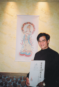一九九六年,他陸續畫了三十三觀音中的十幅作品,之後三年又完成另十幅作品,有如神助,繪畫時筆隨意轉、揮灑自如。「我常去植物園臨摹荷花,尤其受到敦煌壁畫、法海寺壁畫的影響,」他說,佛畫尤以法相的勾勒及線條功力最難,每畫一幅作品,必以最嚴謹恭敬之心,從打稿、定稿、白描、上框、設色,按部就班、小心翼翼,不容絲毫懈怠。